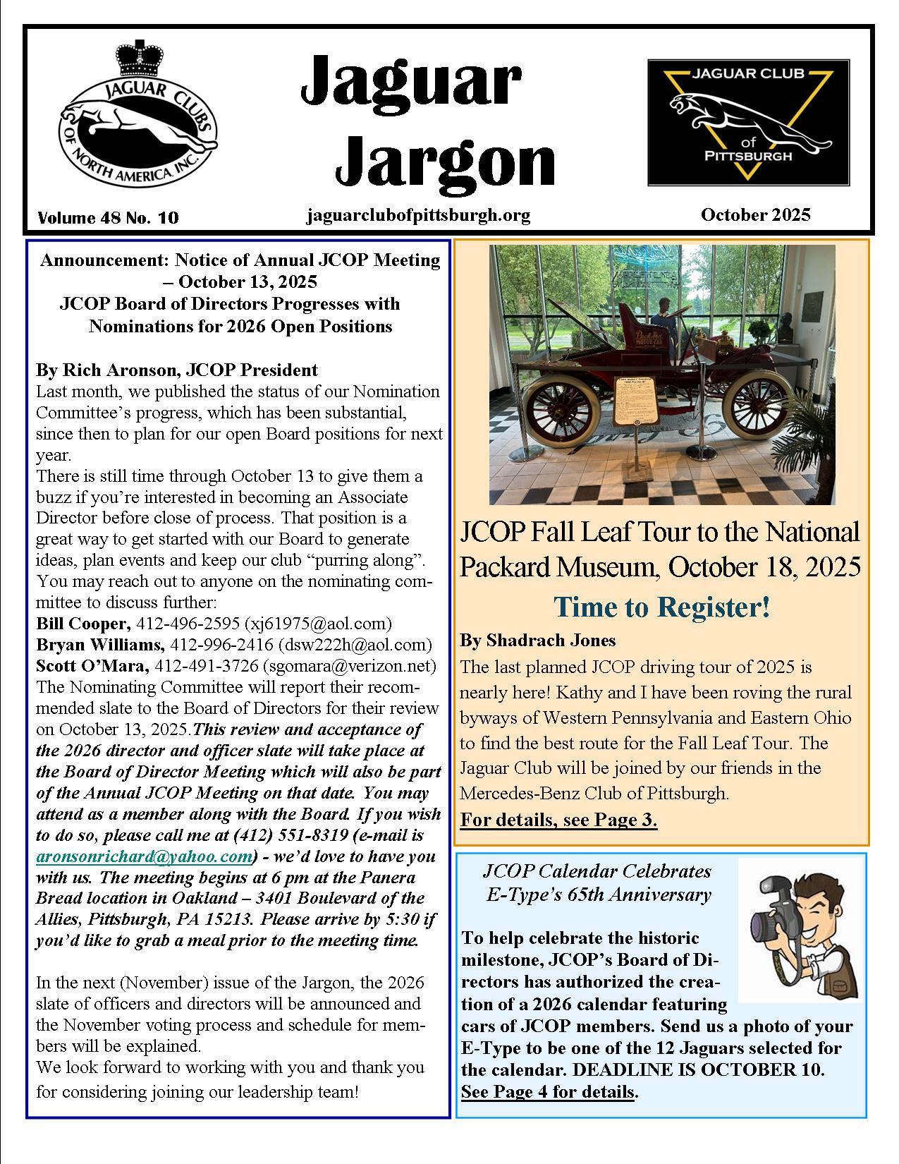 Jaguar Club Of Pittsburgh NC Region - Club #45 Formed: 1971 Members: 100 plus Jaguar Club of Pittsburgh is a friendly group that provides a schedule of events that all Jaguar enthusiasts can enjoy. Hardly a month goes by that there isn't some reason to get together, from tech sessions to dinners to drives to nice locations to car shows to Concours d'Elegance to weekend trips to interesting events and activities. We'd love to have you join us! Check out past Jaguar Jargon newsletters on our website to see the range of wonderful events we enjoy.